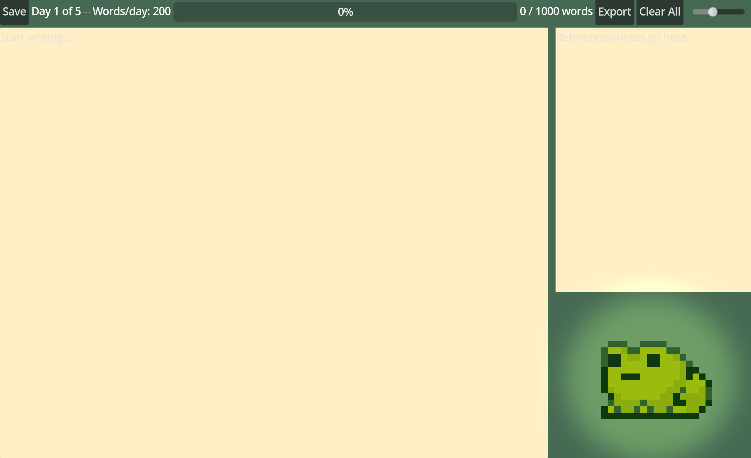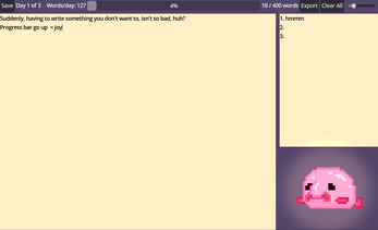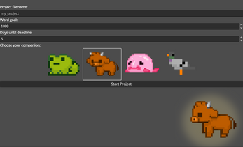 You can setup the word count, how many days you have until the deadline and choose one of 4 cute animals with a few different animations each. There's also an extra area for you to put your references or notes in, which won't affect the word count. As you write, your progress will be tracked automatically, and saved on every text change.